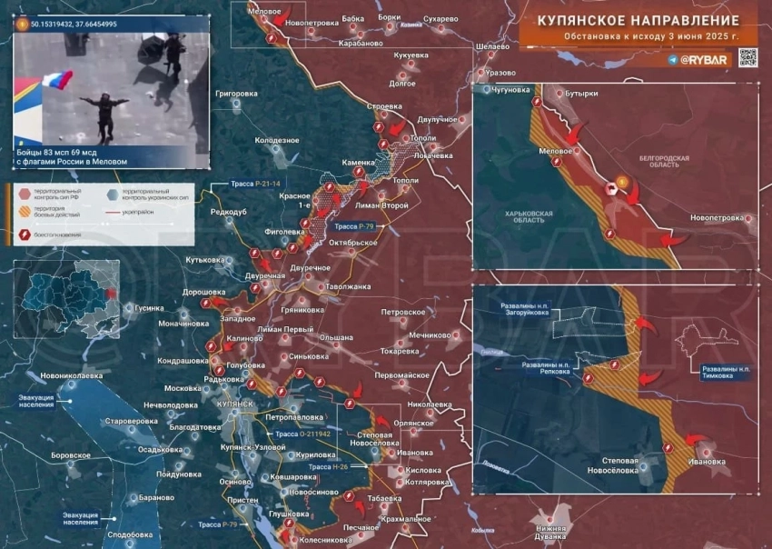 На Купянском направлении ВС РФ расширяют подконтрольную территорию южнее Кондрашовки. Есть тактические успехи севернее Петропавловки. МО РФ сообщило об освобождении с. Меловое, что в 23 км к северо-западу от Тополей и примерно на таком же расстоянии от Великого (Большого) Бурлука - важнейшего логистического узла для снабжения ВСУ на Харьковском и Купянском направлениях.