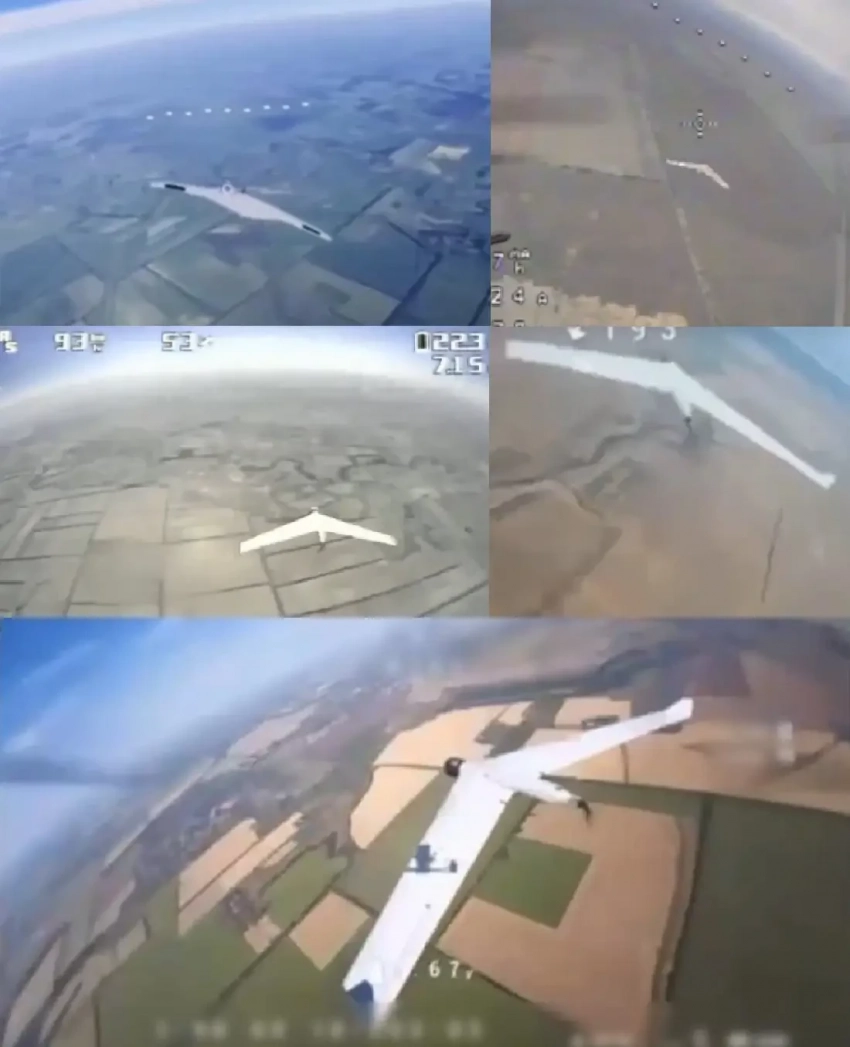 Кадры из видео успешных и неуспешных атак украинских FPV-перехватчиков на российские разведывательные БПЛА самолётного типа