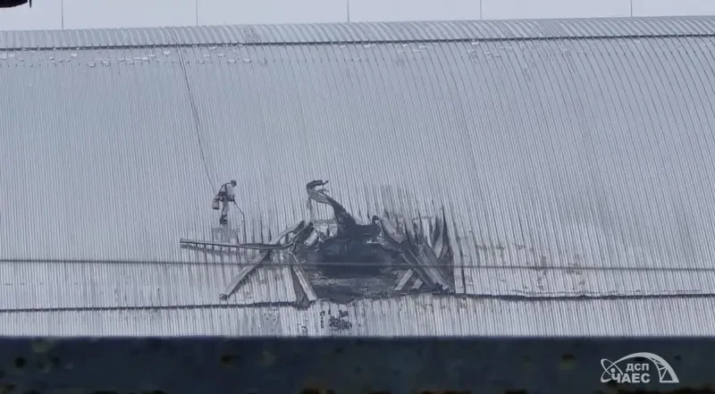 След от взрыва на крыше саркофага ЧАЭС