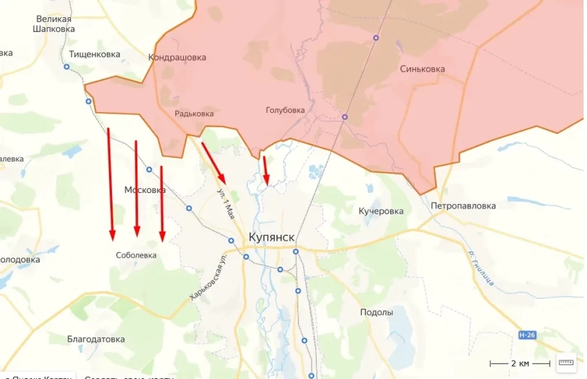 Кроме того, как пишут аналитики, ситуация существенно осложняется значительным расширением «района проникновения» российских военных, который тянется вплоть до Соболевки, что позволяет планомерно охватывать Купянск с северо-западного направления.
