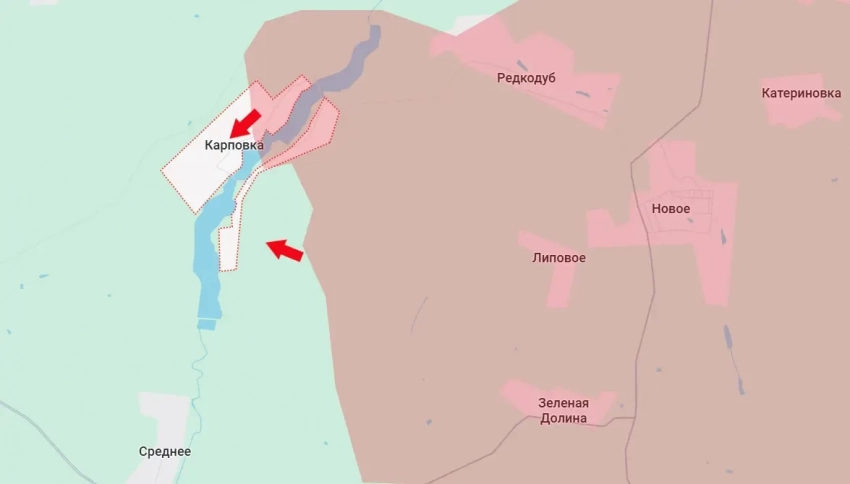 Противник делал значительную ставку на рубеж обороны в Карповке именно ввиду того, что там есть водохранилище – естественная преграда. Однако этот рубеж обороны врага пал, и теперь перед ВС РФ открывается возможность по выходу к южной оконечности Оскольского водохранилища. До него – ровно 10 километров.