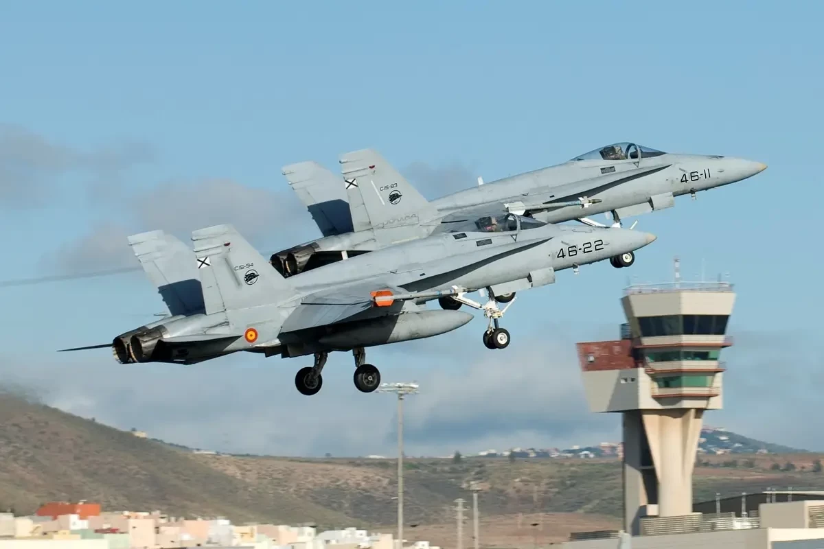 Пара F/A-18A+ из 46-го авиакрыла ВВС Испании взлетают с авиабазы Гандо , Гран-Канария , в феврале 2008 года
