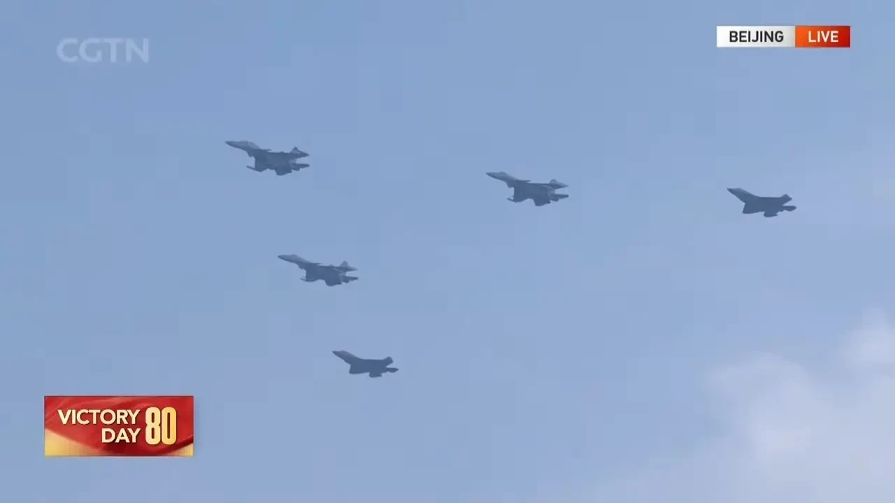 Наибольший интерес представляла смешанная эскадрилья истребителей. В неё вошли хорошо известные самолёты J-16, а также современные J-20 в одно- и двухместной версиях. Учебно-боевой истребитель J-20S присутствовал на параде первый раз. Кроме того, в парадный строй впервые включили перспективный истребитель J-35. Все новые образцы такой техники поступают на вооружение ВВС.