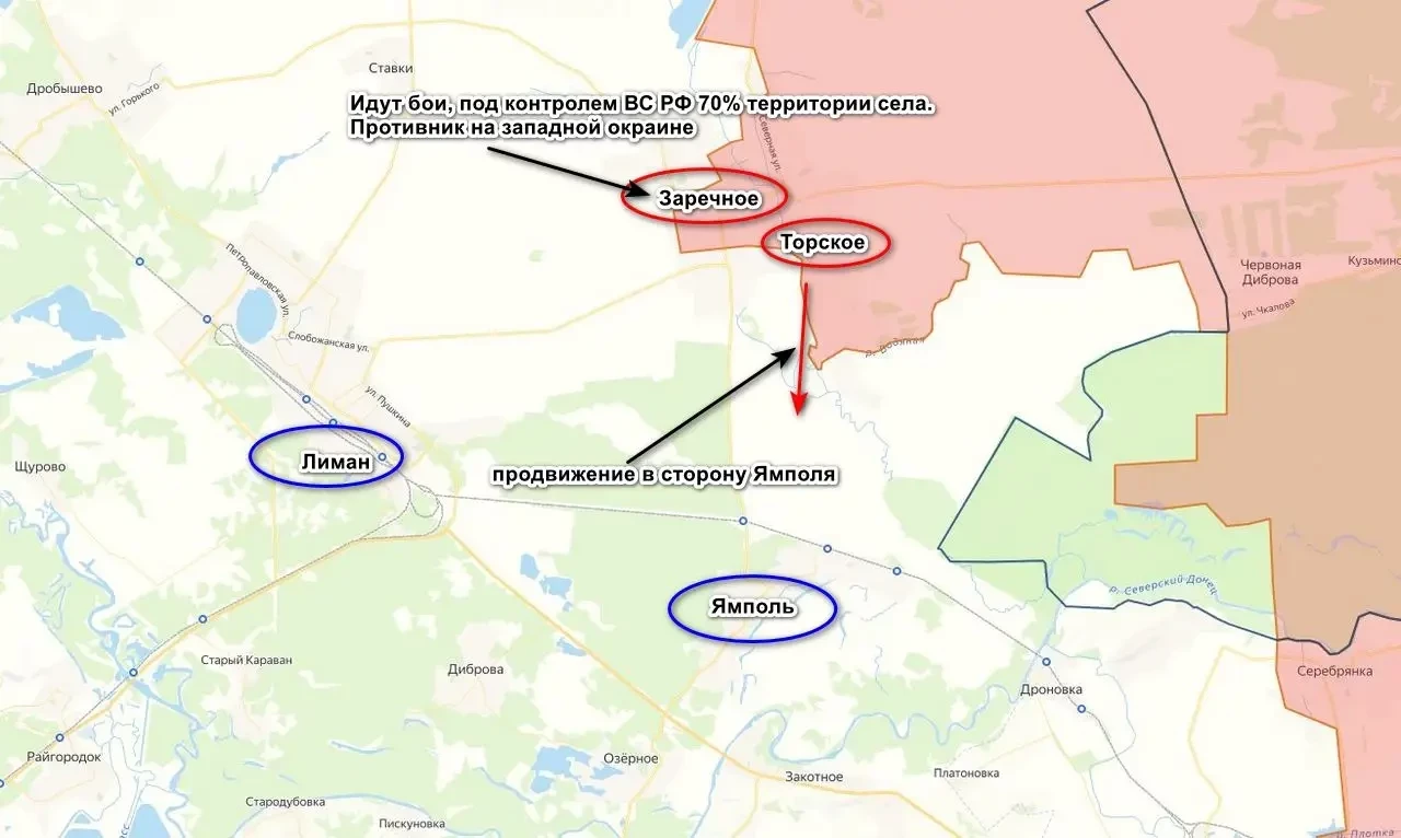 Кроме того, ВС РФ расширили зону контроля южнее Торского, атаковав по реке Жеребец в сторону Ямполя. Это позволило нашим не только продвинуться вперед, но и соединиться с подразделениями ВС РФ, действующими юго-западнее Червонной Дибровы.