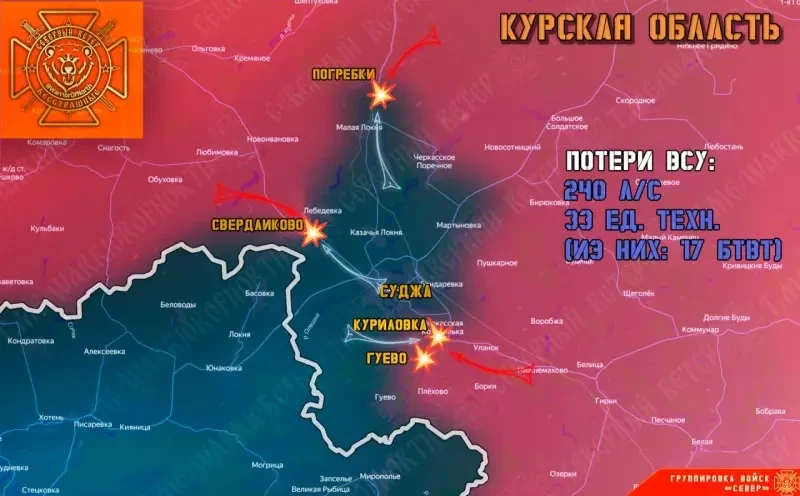 Бои идут на всех направлениях, к востоку от Свердликово десантники зачистили несколько опорников ВСУ и продвинулись в сторону Суджи. Противник отмечает усиление работы российских дронов-камикадзе, в том числе на оптоволокне. Контроль над селом позволяет взять под контроль трассу Юнаковка — Суджа, по которой идет снабжение украинской группировки.