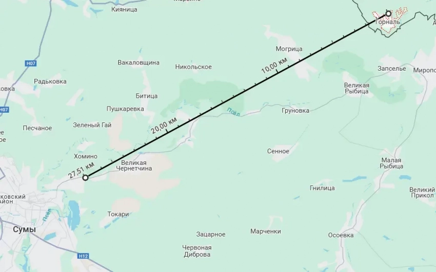 Новое приближение к Сумам позволяет добиваться частично тех же целей. С одной стороны – 29-30 км – достаточно далеко по меркам усреднённого хода боевых действий. Но с другой стороны – такое расстояние свидетельствует о росте возможностей ВС РФ по нанесению огневого поражения объектам и позициям противника в пригородах Сум «обычными средствами», включая артиллерию. Но расстояние до Сум будет ещё меньше указанного, когда наши бойцы освободят курское село Горналь. От него до северо-восточной окраины Сум - менее 28 км.