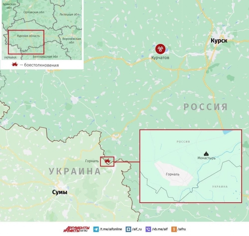 Присутствие противника на территории Курской области сохраняется на лесных участках юго-западнее Олешни и вокруг села Горналь, в том числе на части территории Горнальского мужского монастыря, отмечает Олег Царёв в своём Telegram-канале.
