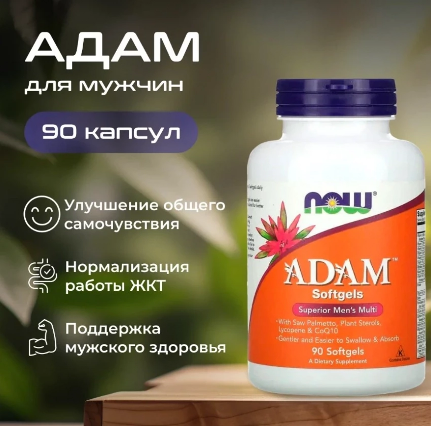 Adam от NOW — это универсальный мультивитамин для мужчин, который уверенно можно включить в топ лучших БАДов для потенции и общего укрепления здоровья. Сбалансированный состав из витаминов, минералов, коэнзима Q10 и растительных экстрактов прокачивает выносливость, нормализует гормональный фон, улучшает функции мозга и ЖКТ, а также поддерживает репродуктивную и сердечно-сосудистую системы. Это не просто витамины — это ежедневная профилактика усталости, стрессов и снижения энергии.