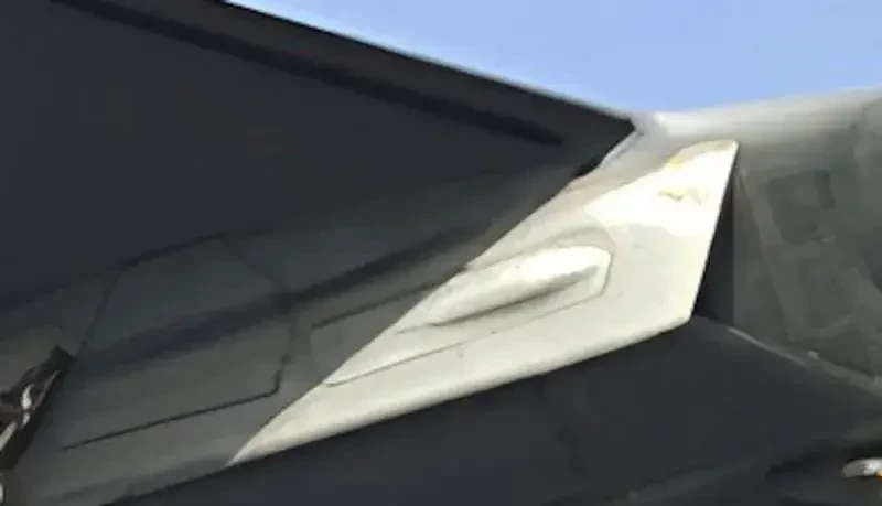 Как уже упоминалось, наиболее интересным на новых фото является то, что на правой стороне фюзеляжа за воздухозаборником отчётливо виден своего рода отсек с ярко выраженной выпуклостью спереди. Он также расположен прямо перед основным отсеком с этой стороны самолёта. Вероятно, симметрично ему на другой стороне может иметься еще один такой отсек.