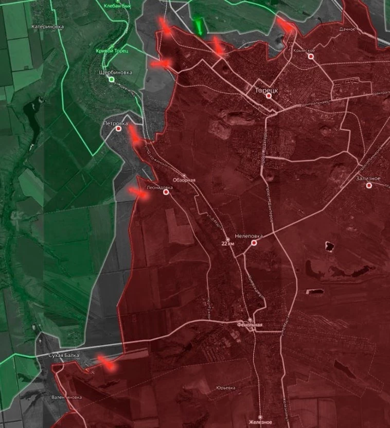 На Торецком направлении бои идут в Старой Николаевке и Щербиновке. К северу от Сухой Балки ВС РФ расширяют подконтрольную территорию на север вдоль окраин Торецка, уточняет военкор Евгений Лисицын в своём Telegram-канале.