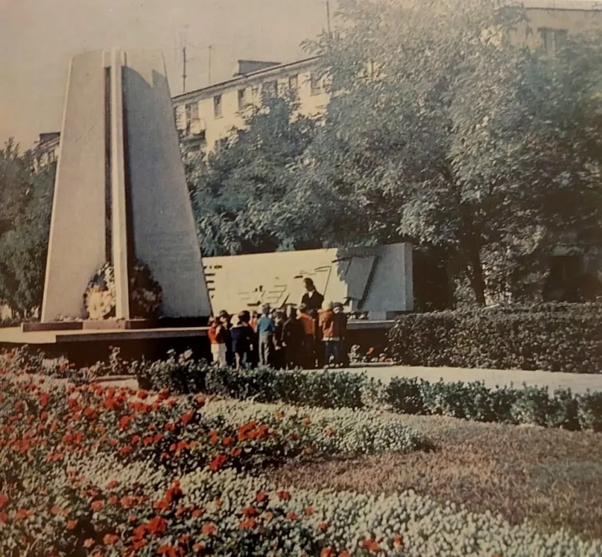 В парке Летчиков у памятника летчикам 230-й Кубанской штурмовой авиационной Краснознаменной ордена Суворова 2-й степени дивизии, павшим в боях Великой Отечественной войны. 70-е гг. ХХ в.