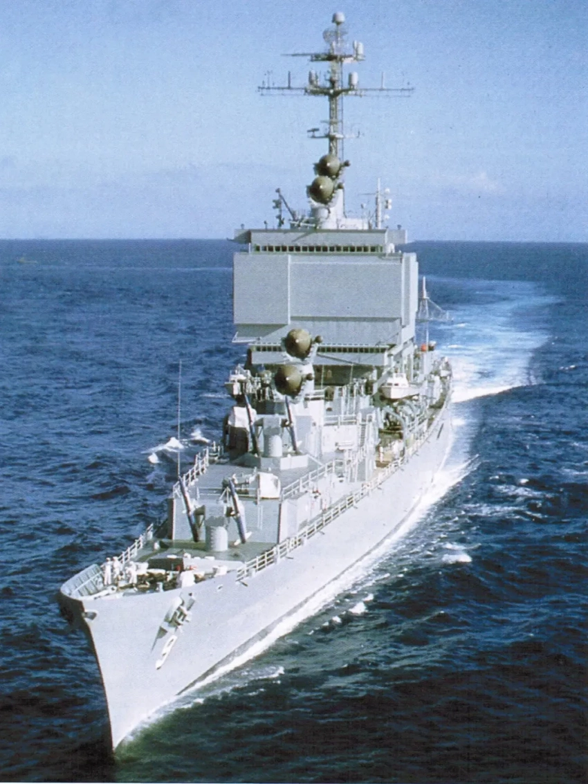 Фотоснимок крейсера «Слава» сделанный с борта палубного вертолёта «Си Кинг» в 1983 году.