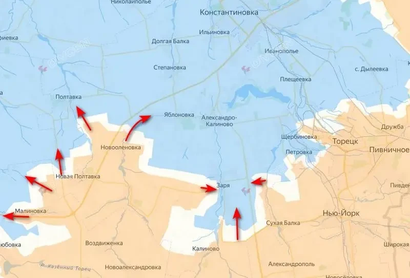 На сегодняшний день российские войска на Константиновском направлении атакуют как на саму Константиновку с юга и заходя ей в тыл с запада, а также пытаются обойти Мирноград с востока и зайти с севера. Накануне ВС РФ на левом фланге вышли к Полтавке и вошли на западные окраины Яблоневки. По центру образовавшегося кармана противник вынужден выводить остатки формирований из Игнатовки и Старой Николаевки, поскольку они попали в огневой мешок. Но, как предполагается, выстроить новую линию обороны у ВСУ по линии Заря — Романовка не получится, выводимые из мешка подразделения практически утратили боеспособность.