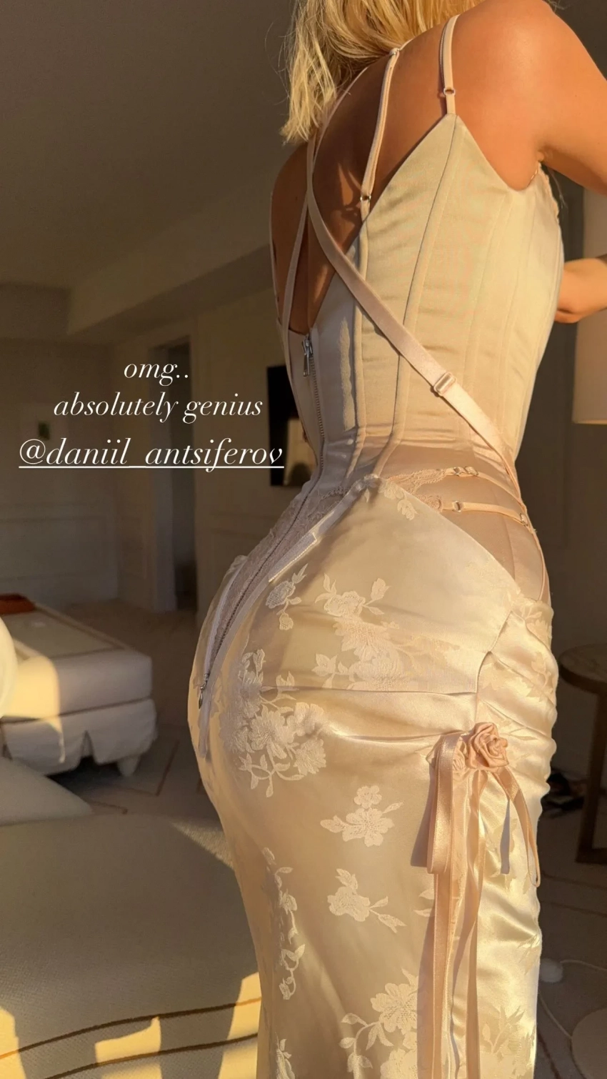 Для выхода в свет модель выбрала наряд в бельевом стиле российского дизайнера Daniil Antsiferov с атласным корсетом и имитацией полурасстёгнутой юбки. На сам вечер она прибыла в компании бойфренда — 29-летнего манекенщика Тараса Романова.