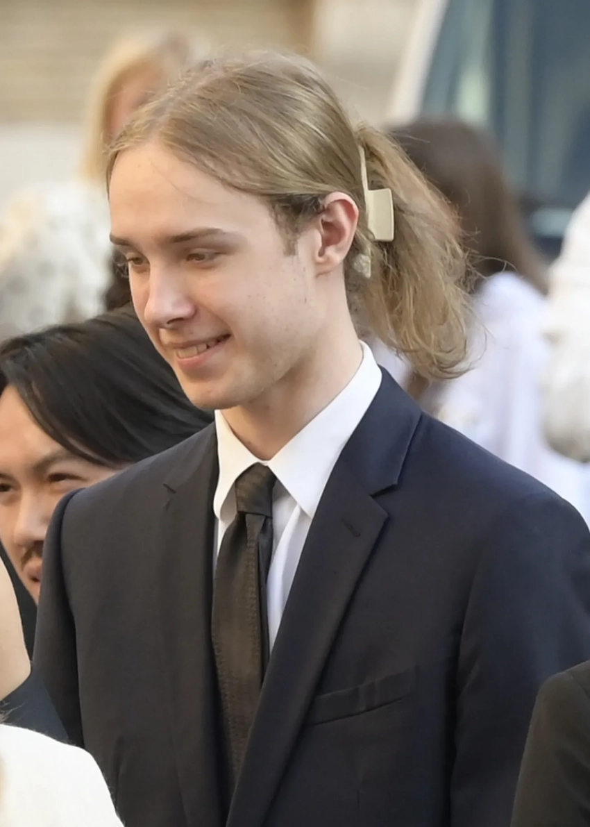 Звезду с сыном засняли во время выхода из машины. Наталья была одета в вечернее платье Valentino, а Лукас — в синий брючный костюм с галстуком. Длинные волосы наследник модели заколол "крабиком".