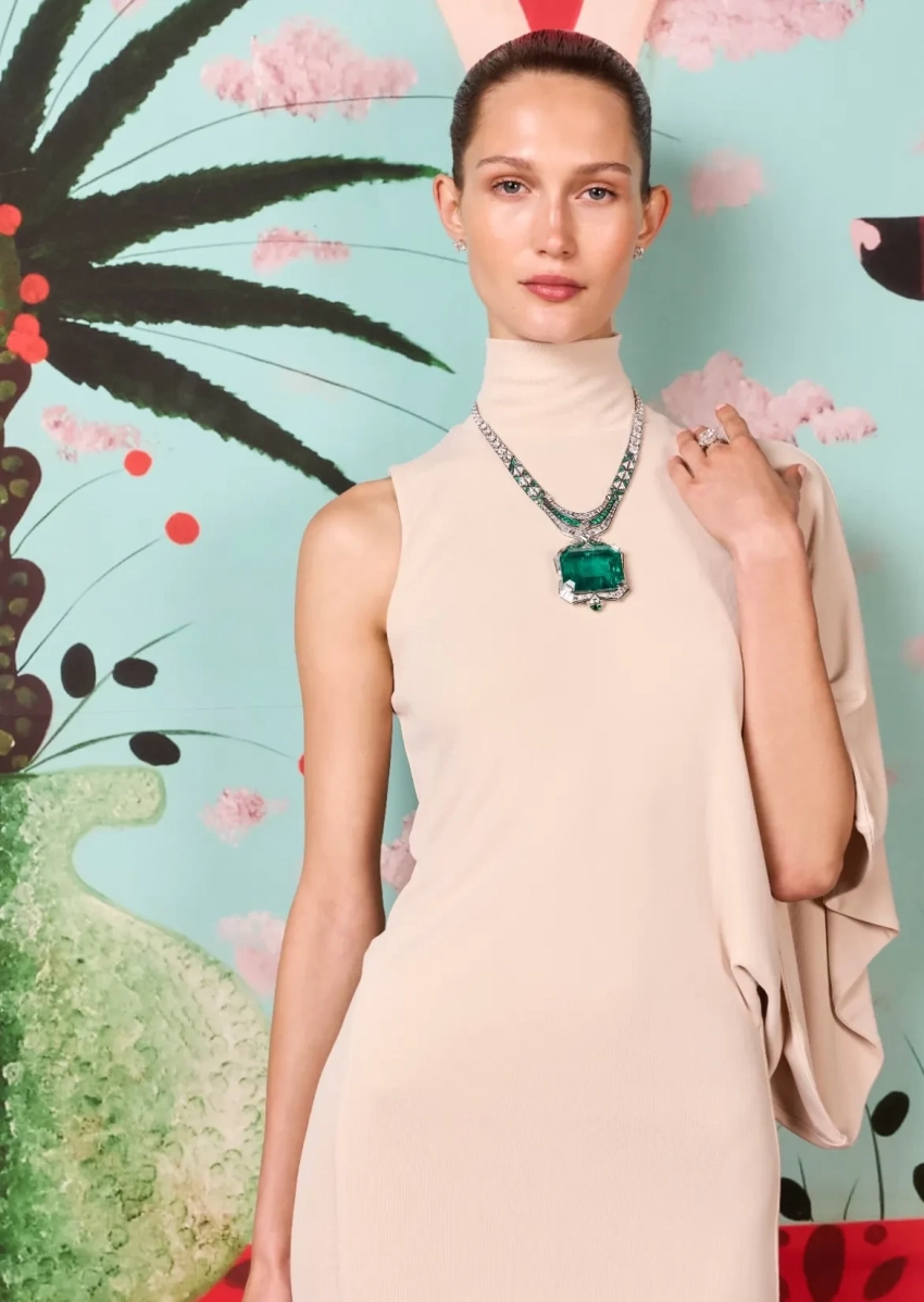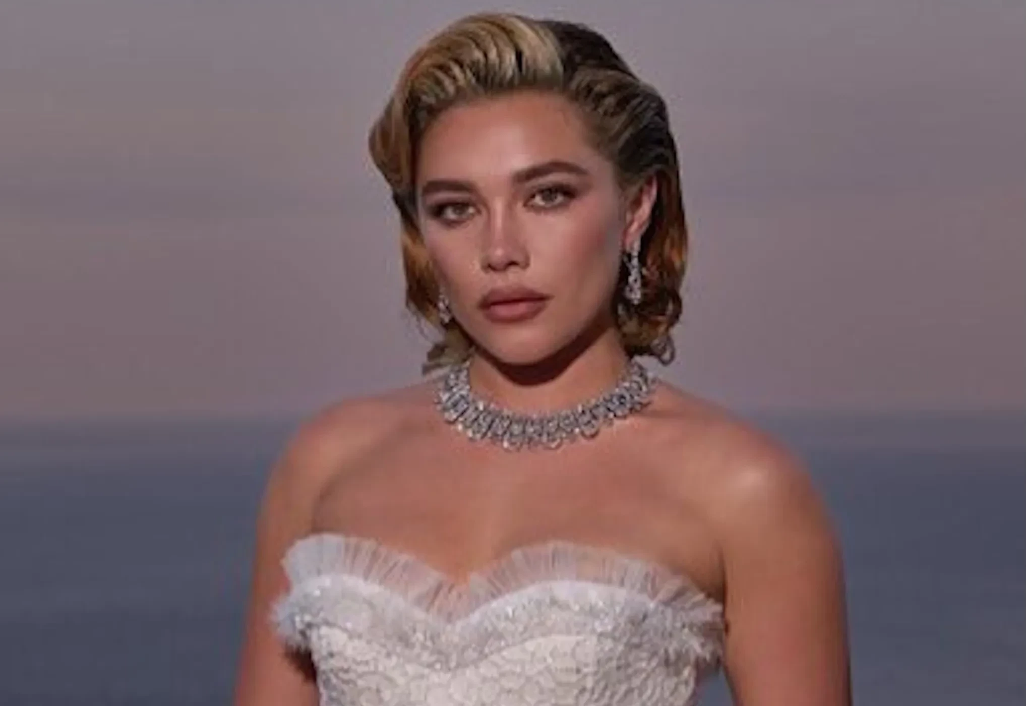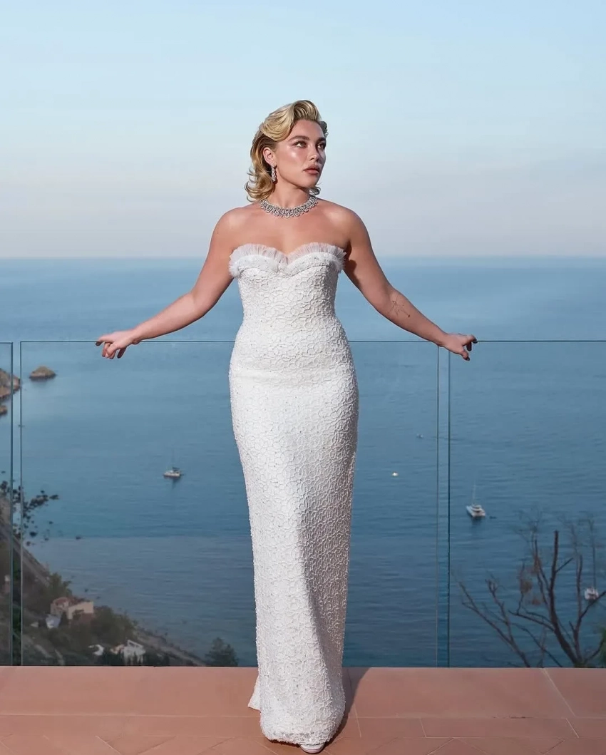 Британская актриса Флоренс Пью позировала на террасе в белом платье Rodarte и колье Bvlgari. Остальные гости тоже примерили ожерелья и другие бриллиантовые украшения ювелирного дома.