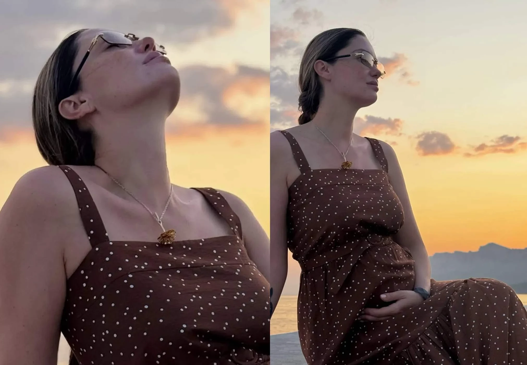 Актриса уточнила, что снимки сделала 9-летняя Мия. “Миюшка сфоткала”, — написала она. На кадрах Муцениеце сидит на пляже на фоне заката в коричневом платье в горошек. Один из снимков запечатлел её с рукой на округлившемся животе: актриса ждёт ребёнка от своего жениха Петра Дранги (хотя в сети ходят слухи, что его настоящим отцом является миллиардер Сулейман Керимов).