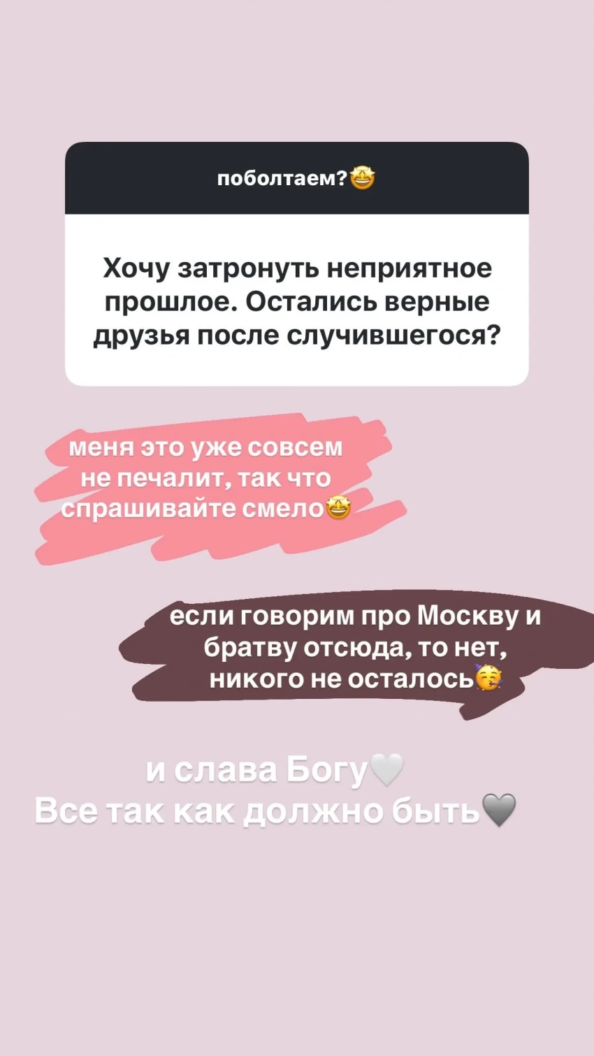 "Если говорить про Москву и братву отсюда, то нет, никого не осталось. И слава богу. Всё так, как должно быть", — написала 34-летняя Ивлеева в своём инстаграме*, добавив, что произошедшее (то есть весь скандал с вечеринкой) её уже не печалит.