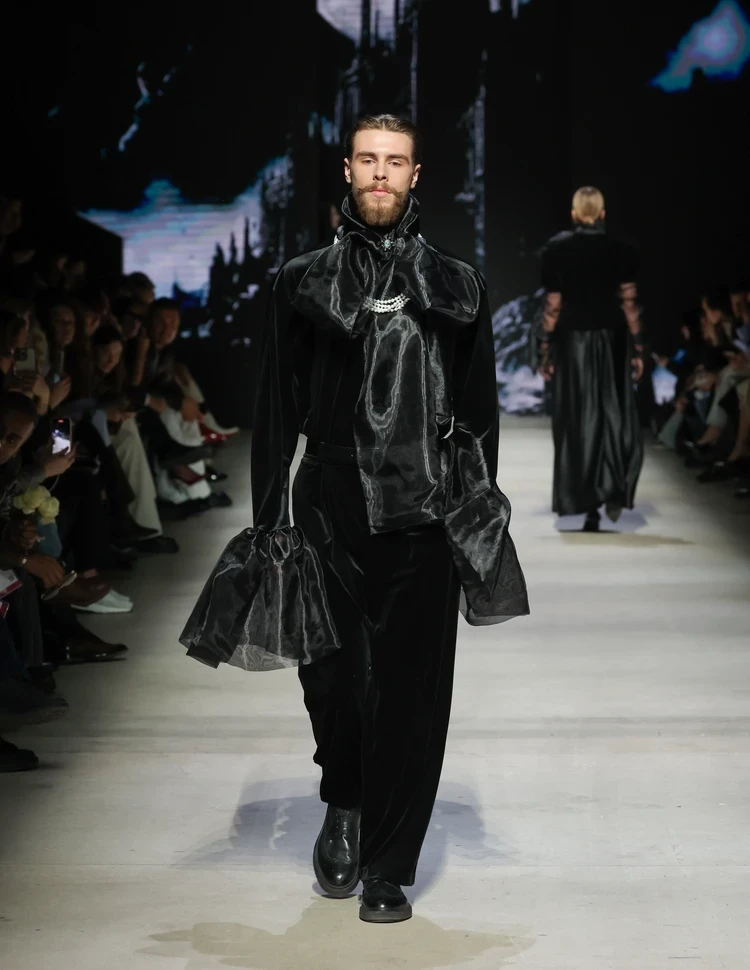 Сюзанна Барс (Maison Suzanna Bars, Москва) вдохновилась декадансом и погрузила зрителей в загадочную Викторианскую эпоху, и мы бы даже сказали — в настоящее готическое кино! Зрители перенеслись во времени и посмотрели, как дамы в старинных платьях и головных уборах Викторианской эпохи прогуливались по темным улочкам. А нам это шоу чем-то даже напомнило нашумевший показ итальянского бренда Schiaparelli в Диснейленде.