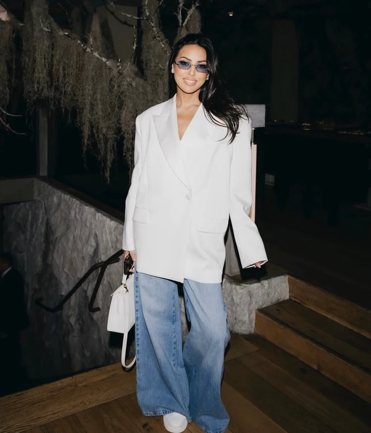 Алсу показала, как носить белый парадный жакет в обычной жизни. Она сочетала его с широкими джинсами и базовыми белыми кедами. Дополнила образ белой сумкой и очень красивыми эффектными очками с синими линзами. Из украшений только серьги-пусеты. Плюс небрежная укладка. Очень простой и при этом стильный образ.
