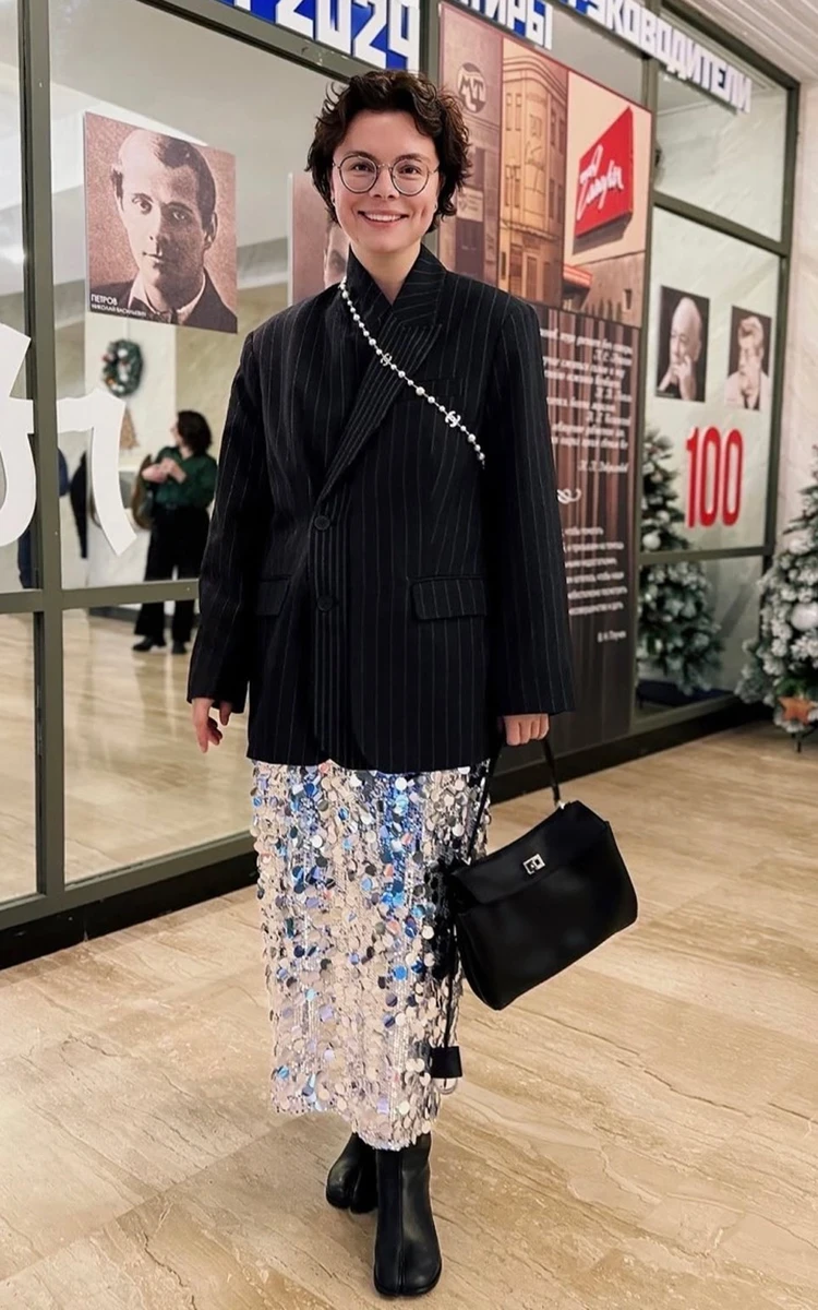 Татьяна сочетала черный жакет в полоску с нарядной серебристой юбкой с пайетками и любимыми двупалыми сапогами. Украшение Chanel молодая супруга Петросяна перекинула через плечо, и получилось довольно интересно. Дополнила образ черной сумкой. Мне все нравится, но очень хочется снять очки, сделать темный макияж глаз, а волосы забрать назад, создав «мокрый эффект».