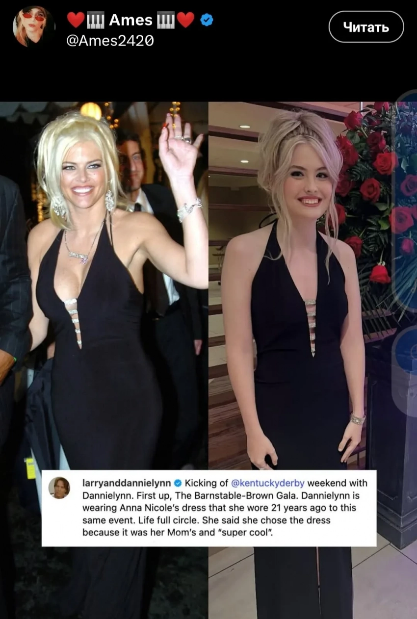 Дэннилин и Ларри БиркхедДэннилин и Ларри БиркхедАнна Николь СмитСтоит отметить, что скачки Kentucky Derby имеет особое значение для Ларри и Дэннилин, поскольку Анна Николь впервые встретилась с будущим отцом ее дочери на гала-вечере Barnstable Brown в 2003 году. Напомним, что знаменитая модель Playboy умерла в возрасте 39 лет в 2007 году, оставив все состояние дочери.