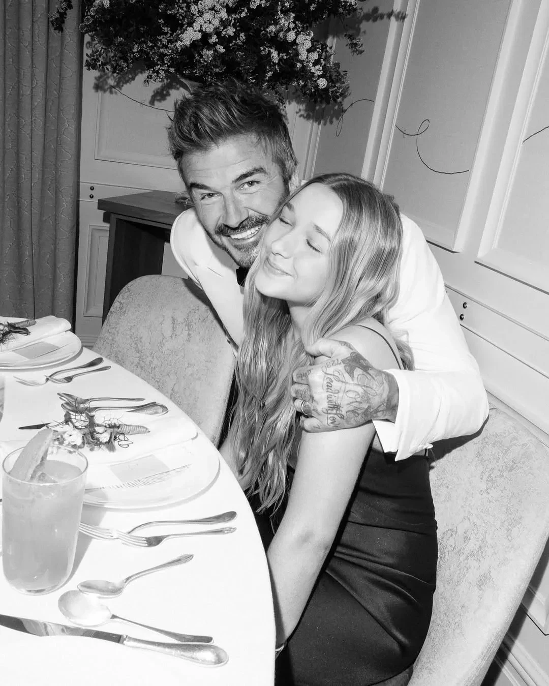 На кадрах футболист позирует в белом смокинге вместе с женой и младшими детьми: 22-летним Ромео, 20-летним Крузом и 13-летней Харпер, а также танцует и веселится с друзьями. Виктория для вечера выбрала белое асимметричное платье, а Харпер надела красное платье-комбинацию.