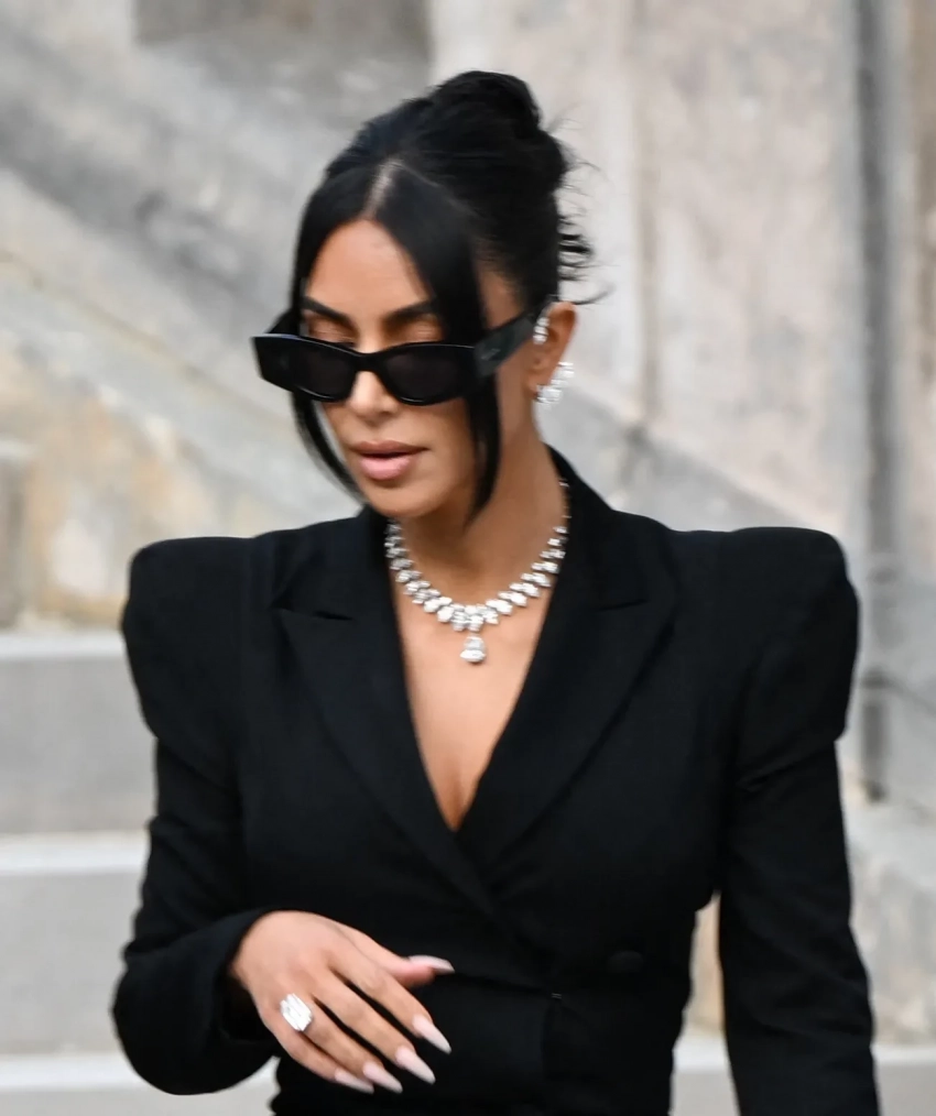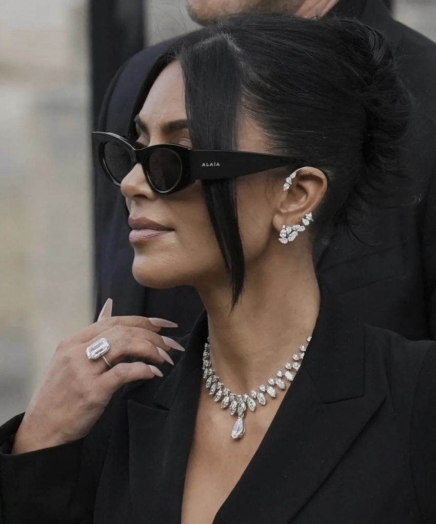 44-летняя экс-супруга Канье Уэста появилась на заседании в винтажном костюме John Galliano и туфлях Saint Laurent, но больше всего внимания привлекли её ювелирные украшения. Ким позировала папарацци около здания суда в бриллиантовом колье Samer Halimeh стоимостью 3 млн долларов. Изделие из 18-каратного белого золота украшают 80 бриллиантов и камень грушевидной формы в 10,13 карата. Общий вес ожерелья — 52,17 карата.