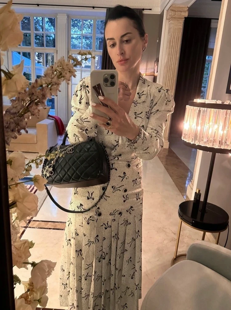 Как и Светлана Бондарчук, Тина примерила романтичное платье в ретро-стиле. Особенность наряда в рукавах-фонариках и плиссированной юбке. И, конечно же, в принте в виде кокетливых бантиков. Лук звезда дополнила классической сумкой Chanel, правда, с обвесом. Канделаки собрала волосы наверх и сделала легкий макияж. Но мне, конечно, куда больше нравятся драматические образы Тины с кожей и алыми нарядами.