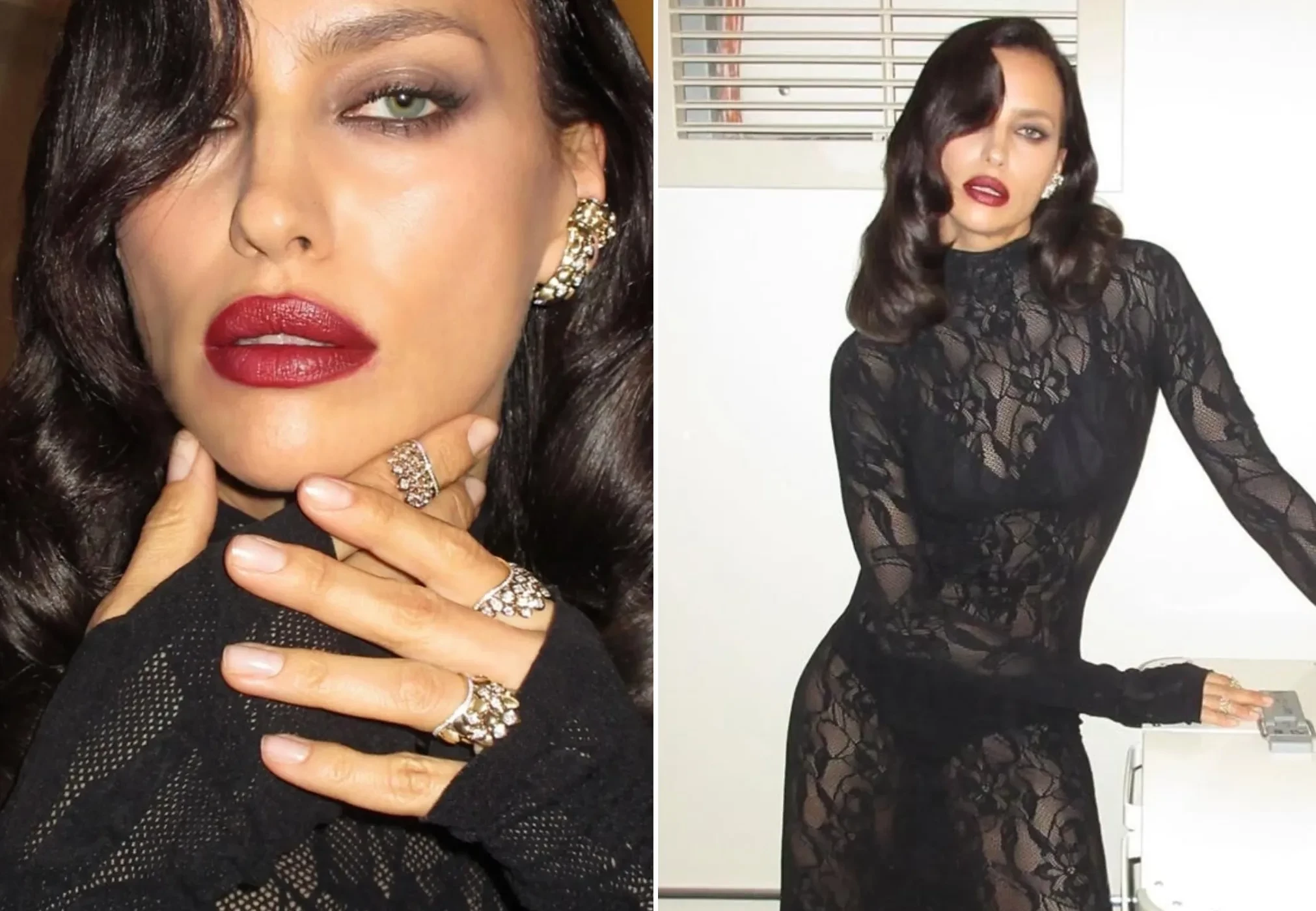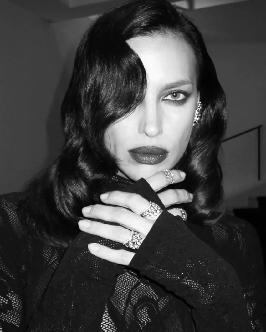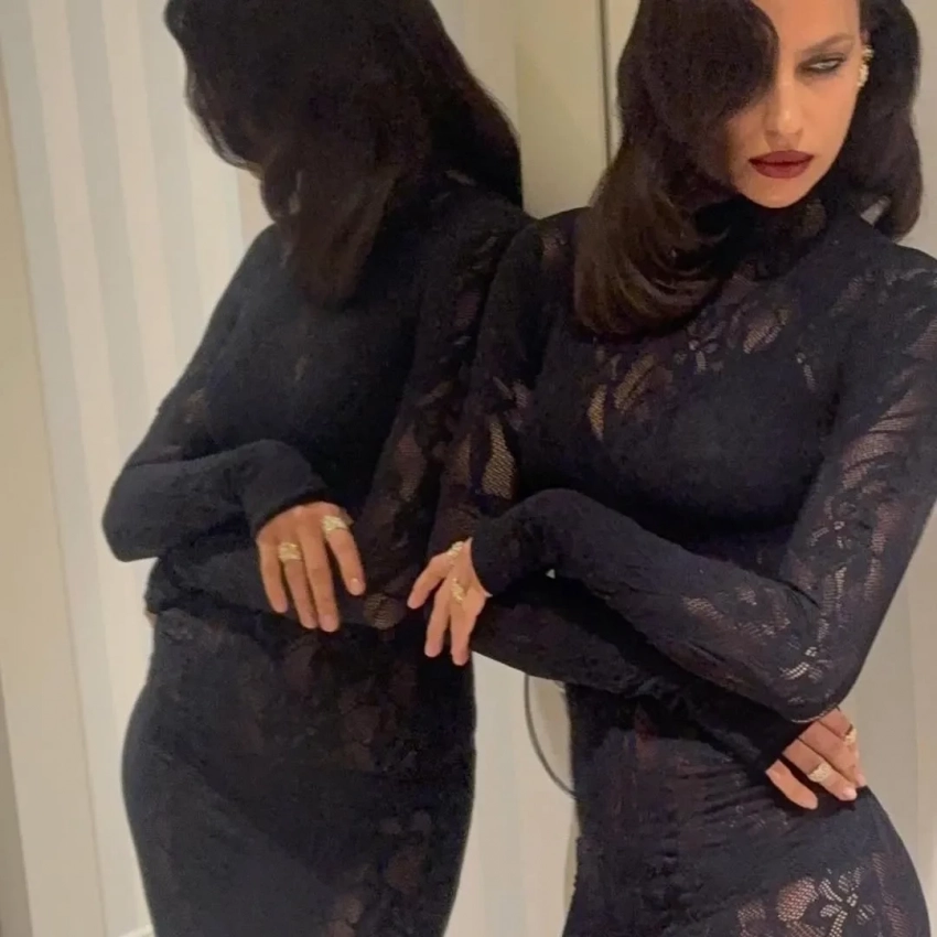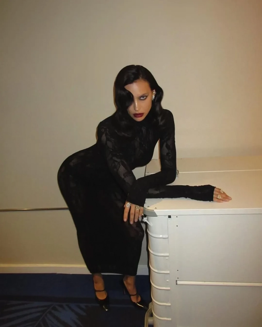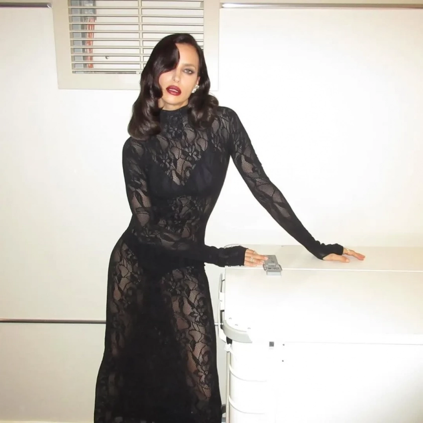 Экс-возлюбленная Брэдли Купера примерила чёрное кружевное платье Les Filles d'Eva, дополнив образ голливудской укладкой, тёмной помадой и бриллиантовыми украшениями. Модель также опубликовала снимок из постели, вероятно, сделанный после мероприятия. "Прекрасная ночь", — написала Шейк.