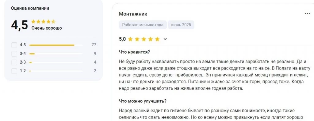 Отзывы о работе в «ПОЛАТИ» подтверждают, что успешное обучение дает возможность устроиться в компанию согласно ТК с высокой заработной платой, которая, к примеру, у рядового монтажника составляет порядка 130 тысяч рублей. Дополнительно компания берет на себя расходы на питание для работников, их доставку на объекты, проживание. В отзывах о «ПОЛАТИ» сотрудники на вахте нередко отмечают, что у них практически нет дополнительных расходов, так как их базовые потребности на время нахождения на объекте закрываются за счет работодателя.