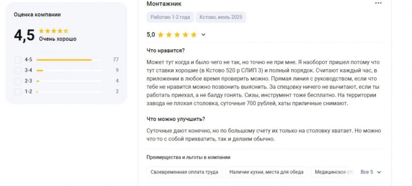 Подобные неудобства компенсируются высокой заработной платой, на которую не всегда можно рассчитывать в других строительных компаниях. Также для сотрудников создаются комфортные условия пребывания на объекте — для них арендуется жилье, предоставляется горячее питание, выдаются инструмент, спецодежда и обувь, средства индивидуальной защиты. Рабочие и организационные вопросы, по отзывам работников компании «ПОЛАТИ», оперативно решаются на месте — руководство всегда открыто к диалогу. Ведь в компании понимают, что ее бесценным активом являются люди, которые на работе должны думать о выполнении своих профессиональных обязанностей, а не о решении бытовых вопросов.