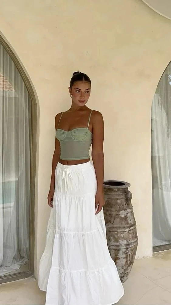 Сейчас в тренде эстетика latina faerie — легкая, воздушная, слегка кокетливая. И белая юбка в сочетании с укороченным топом идеально вписывается в эту стилистику.