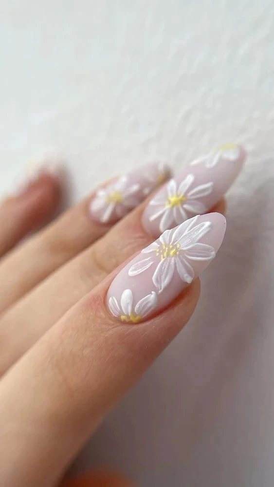 Простые, будто нарисованные от руки ромашки и маки — последний штрих в летней палитре. Без симметрии и совершенства, зато с очарованием. Особенно круто смотрятся на коротких ногтях и светлом фоне.