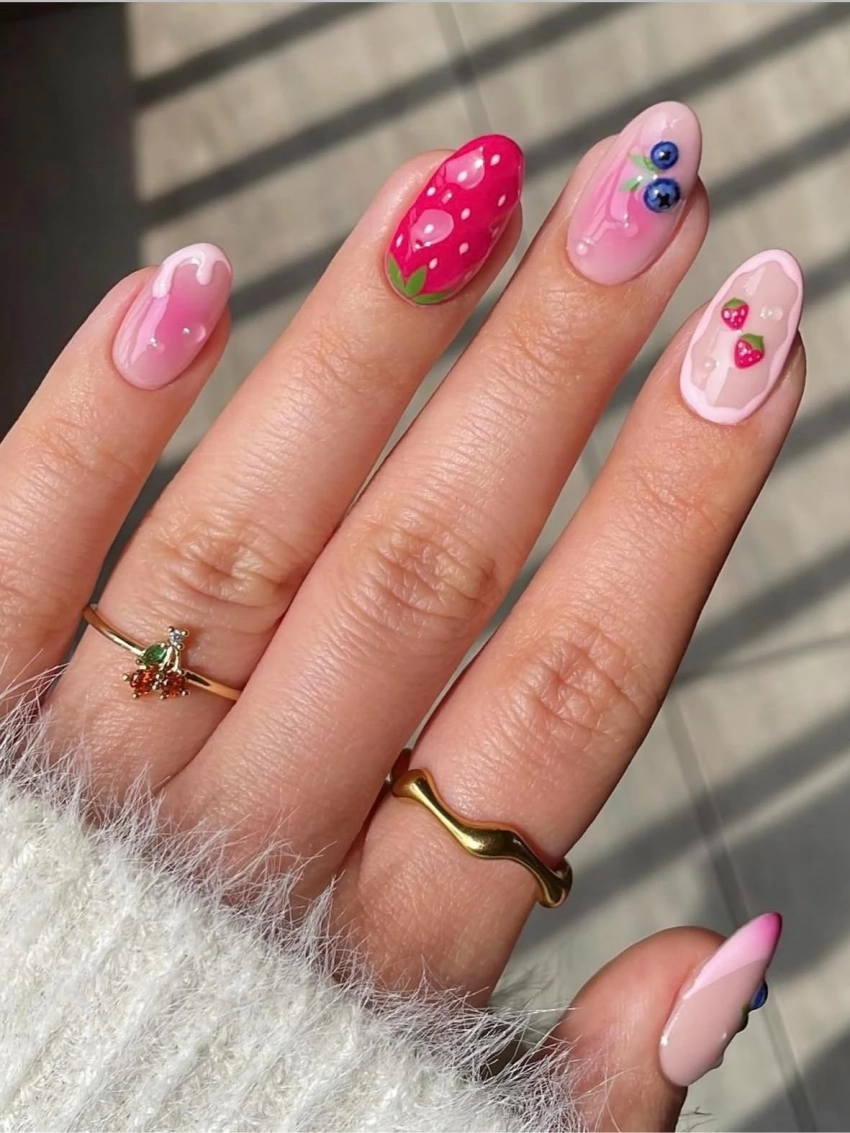 Оттенки малины, клубники, вишни — это про чувственность, харизму и страсть. Они активируют внутренний магнетизм и привлекают внимание противоположного пола. Такой маникюр особенно уместен, если вы хотите ярких эмоций и романтических встреч. А летом — это как раз то, что нужно!