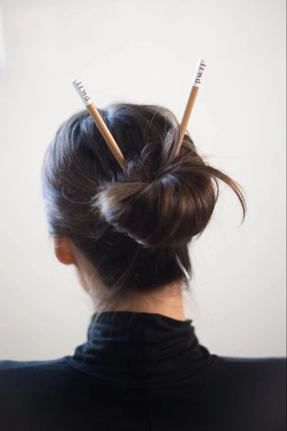 • низкий пучок с палочкой — строго и элегантно.