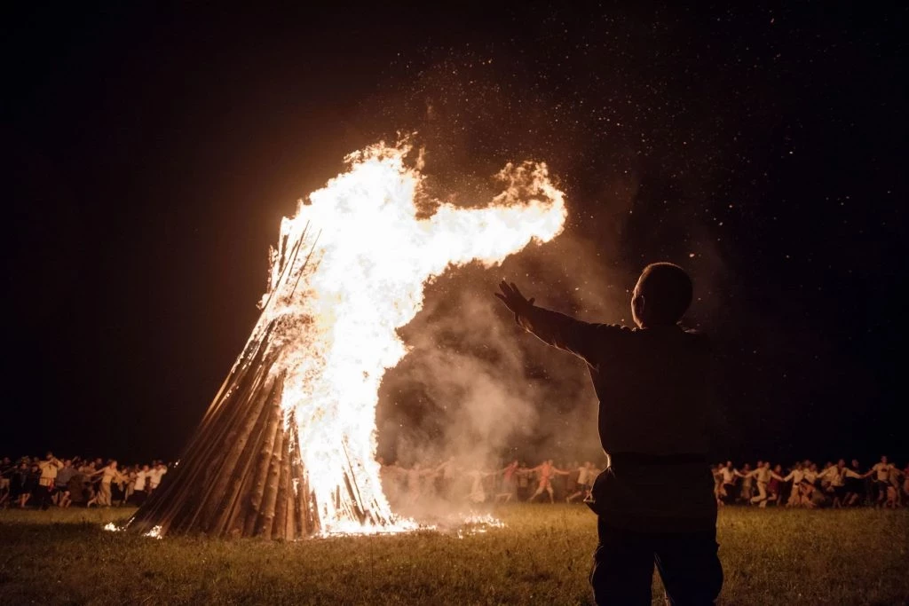 Огненные костры и прыжки через пламя — один из самых известных обрядов, символизирующий очищение и укрепление здоровья. Влюблённые пары, держащиеся за руки, пытаются перепрыгнуть через огонь, чтобы укрепить свой союз и обрести счастье.